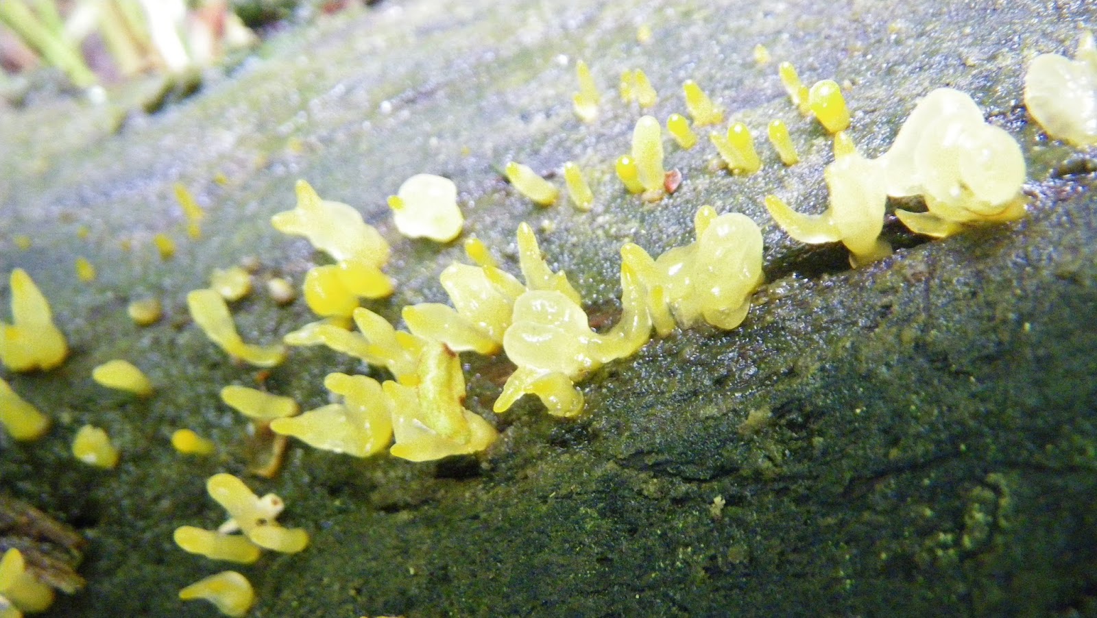 Pale Stagshorn Calocera pallidospathulata was found today at Dinas RSPB (when not looking for birds!) on a very rotten log, possibly Alder. This species was first found in Yorkshire in 1969 then gradually spread to all parts of the UK. Recognized by the pale, usually unbranched fb and has a wide substrate range.
